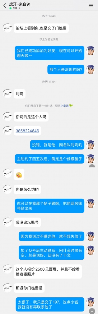 有一个网友加了我QQ, 一沟通就确定我们遇到的都是这个垃圾。本来我以为他只是骗点生活费,但据这位网友说,这个人除了要他交了197元的门槛费后,竟然还向他要2500元的见面费,这就不是小骗的性质了,而是大骗了。因此我必须贴出这个骗子的信息,以防更多网友受骗。