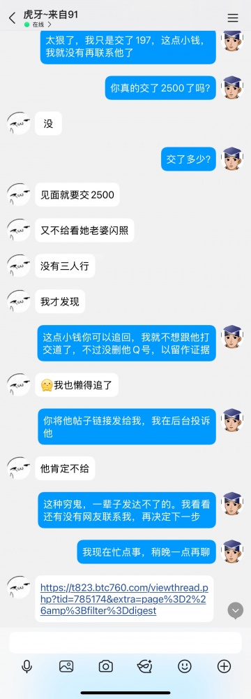 我现在相当肯定这是个非常低级的垃圾,连骗子都算不上,只是想骗点生活费而已,所以根本不屑于去曝光他。我把这个经历写出来,只是希望其他单男在支付门槛费时多留个心眼。