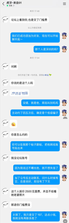 我在今年7月看到一个深圳的男士发的帖子,招夫妻和有经济实力的单男,门槛费是197元。看这么低的费用,我想都没想就加了QQ并支付了费用。